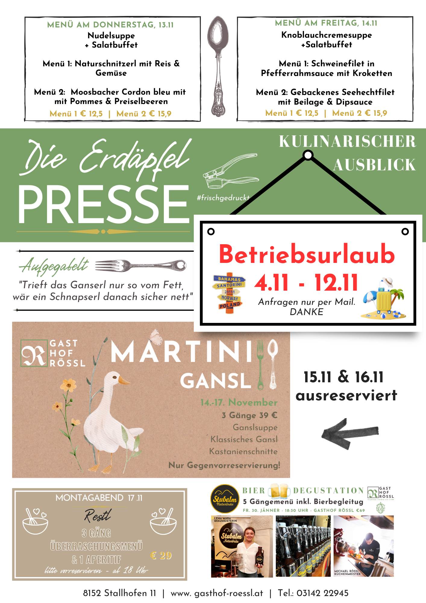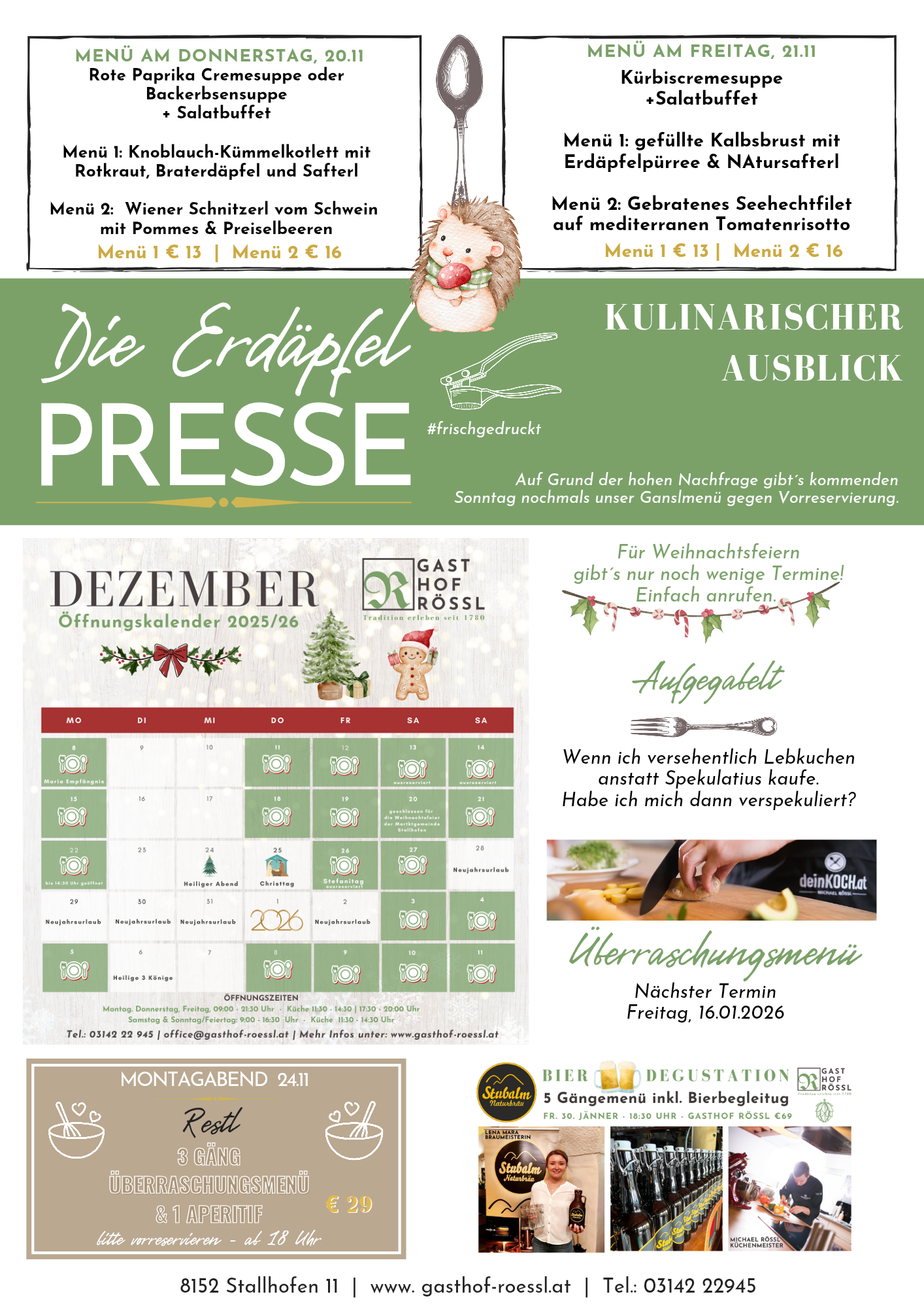 Freitagabend & Samstagabend gegen Vorreservierung. Küchenmeister Michi Rössl zaubert kreative Menüs, einfach zurücklehnen, überraschen lassen und genießen.